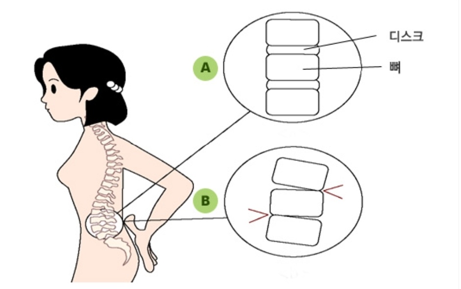 영어로는 디스크라고 부르며 우리는 추간판이라고 부릅니다. 우리의 몸 중 여러 개의 작은 척추뼈가 모여서 척추라는 인체의 기둥을 이루고 척추뼈 사이에는 척추뼈끼리 부딪치는 것을 막아주는 쿠션과 같은 역할을 하는 디스크라는 젤리 같은 구조물이 있습니다. 디스크의 한가운데에는 찐득한 수핵이라는 물질이 있고 주변에 수핵을 둘러싸는 섬유륜이라는 두꺼운 막이 있습니다. 평상시 일어서있는 자세에서는 중력을 받아 디스크가 납작해지면서 바깥으로 볼록하게 나옵니다. 그런데 디스크가 견딜 수 있는 힘보다 큰 힘이 가해지게 되면 손상을 입게 됩니다. 갑자기 무거운 물건을 든다거나 나쁜 자세를 오랫동안 유지하게 되면 디스크에 무리한 힘이 가해져 밖으로 돌출됩니다. 심한 경우 디스크를 감싸고 있는 막이 터지면서 그 안에 수핵이 흘러나옵니다. 이때 돌출된 디스크가 신경을 누르게 되면서 통증을 유발합니다. 우리는 이를 추간판 탈출증이라고 부릅니다. 그리고 많은 분들이 잘 모르고 계시는 게 있는데 가장 큰 원인은 바로 유전입니다. 일란성쌍둥이 150명을 상대로 생활 패턴이 다른 쌍둥이를 비교했더니 몸을 쓰는 것과 상관없이 쌍둥이라는 이유만으로 디스크의 퇴행 정도가 비슷했다고 합니다. 유전이 60%를 차지하고 반복된 무리한 움직임이나 외상에 의해 발생하기도 하고 나쁜 자세도 원인이 될 수 있습니다.
