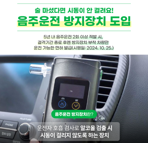 2024년 10월25일부터 5년 내 음주운전 2회 이상 적발 시, 결격기간 종료 후엔 음주운전 방지장치 부착 차량만 운전 가능한 면허를 발급합니다.